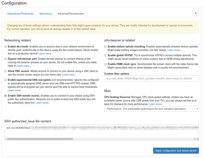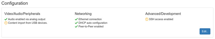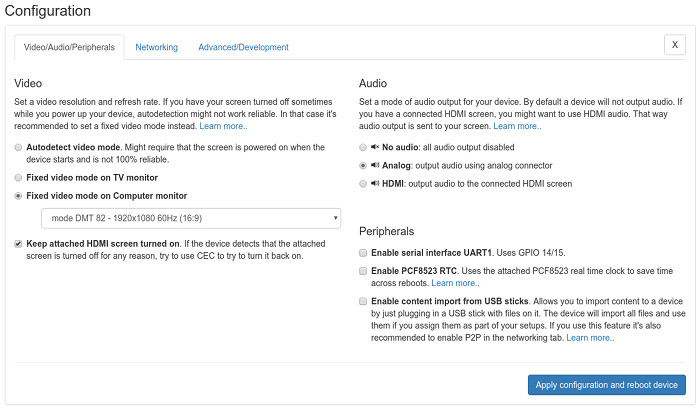 You can now edit almost all device configuration options directly from the web dashboard. This mean you'll most likely never have to revisit the SD card of a running device. Previously you all configuration setting changes required you to edit a file on the Pis SD card. This is now a thing of the past. Change WiFi setting? Switch Audio output from analog to HDMI? No problem!
