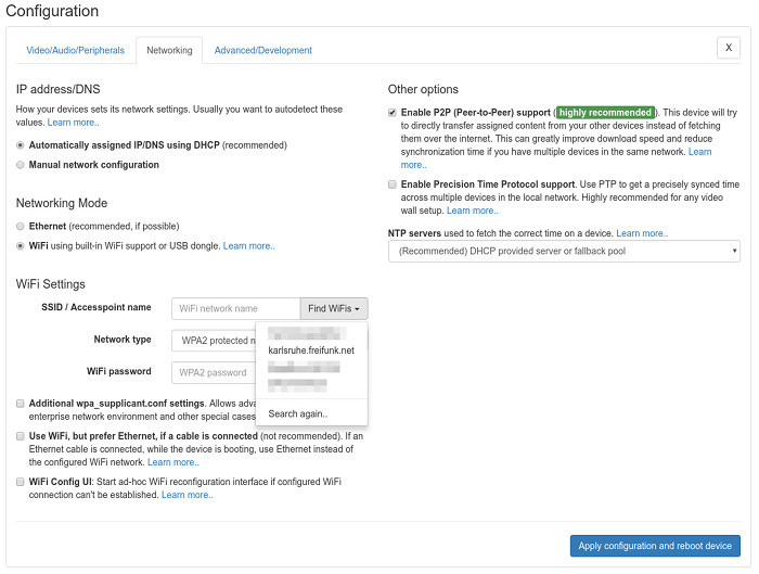 Next is the Networking tab. You can set IP settings and control how your devices connects to the internet. When configuring WiFi you can even scan for all available networks around your device. Finally you can easily enable the P2P, feature for faster downloads.