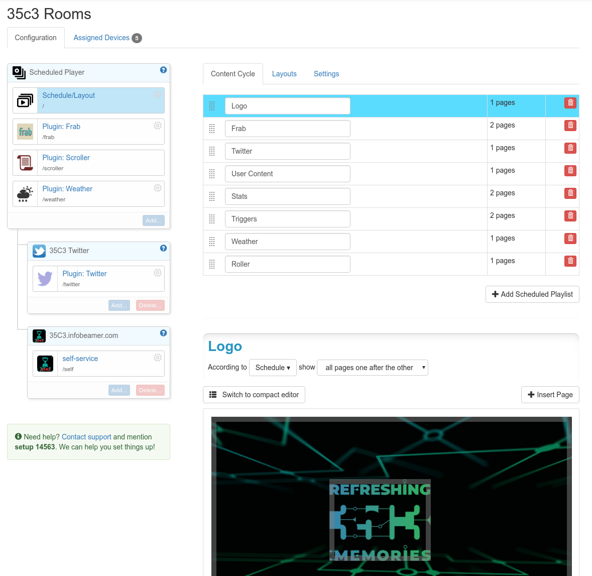 info-beamer hosted, running on the Raspberry Pi controlled the intermission content in five conference halls. The image above showing the setup was taken by seokai.