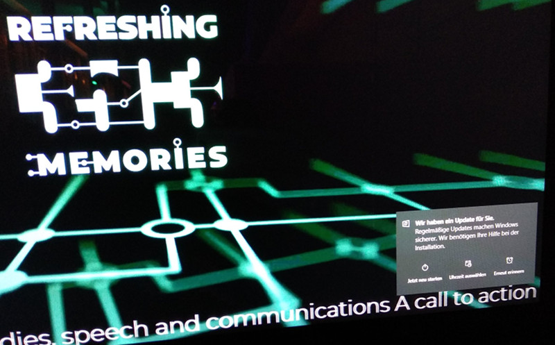 One problem last year was that we didn't have access to the already install TV screens inside the congress center. They run some Windows based digital signage system and we couldn't attach our Pis to the screens directly and were forced to carry around USB sticks with PowerPoint on them. Ugh. Unfortunately this didn't change but we managed to find a somewhat working solution: